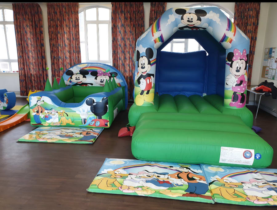 Mickey Mouse Bouncy Castle – with built-in shower cover to keep kids safe from rain or strong sun.