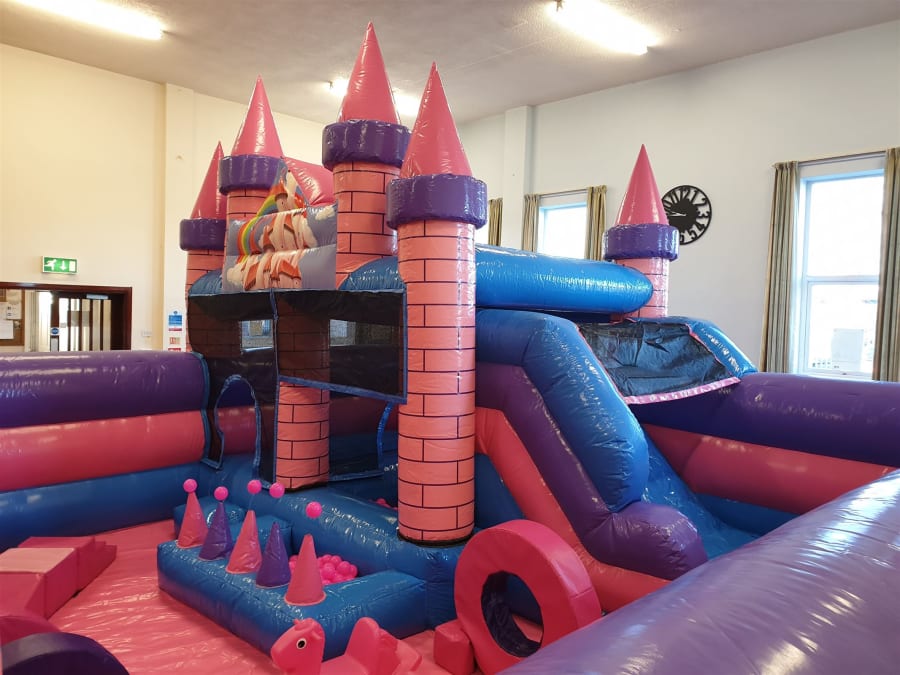 Finished in pretty pink and purple tones this is a huge and hugely impressive party piece and a real money maker for any charity event or school fair. But it is big, so please make sure you check you have the space required before you book, to avoid disappointment on the day. This item is for indoor use only, and you’ll need at least 25ft by 28ft of floor space, plus a ceiling clearance of at least 14ft. If in doubt, please give us a call to confirm suitability.