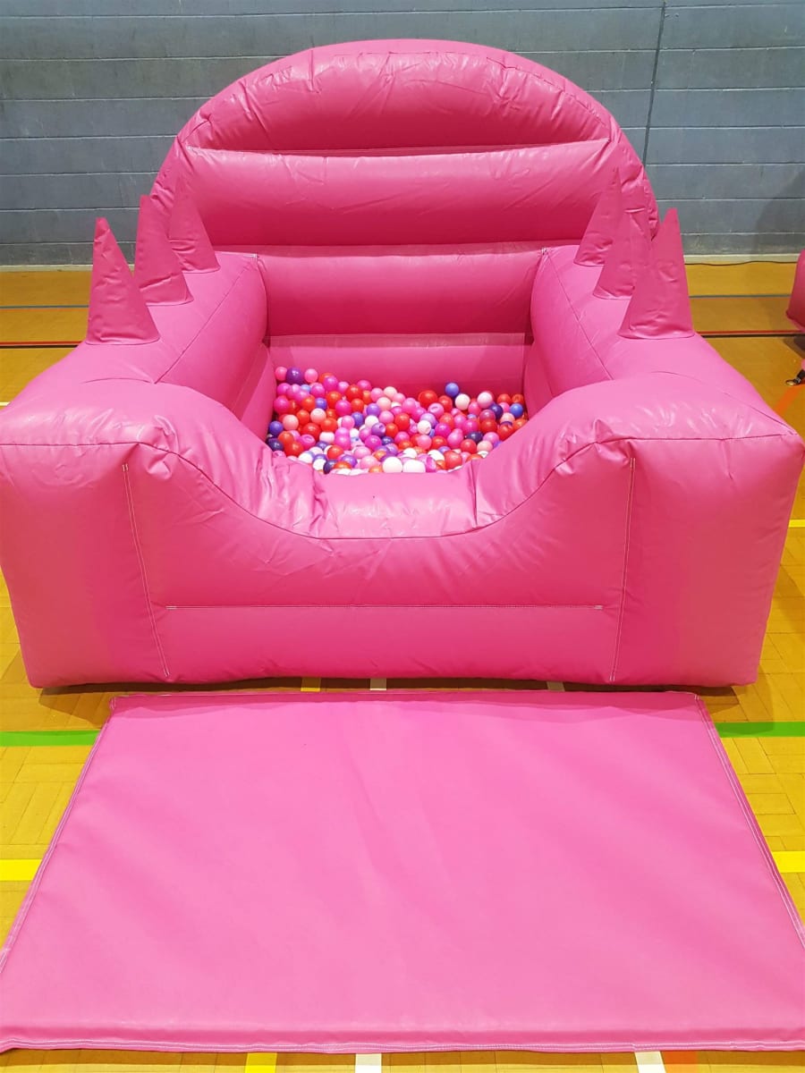 The pink and purple ball pond is fully inflatable, so it has soft, safe, squidgy sides and a high purple back wall to bounce off. And by diverting some of that air up to two rows of cones, we’ve created awesome air jugglers that float the pretty pink balls magically in the air.
