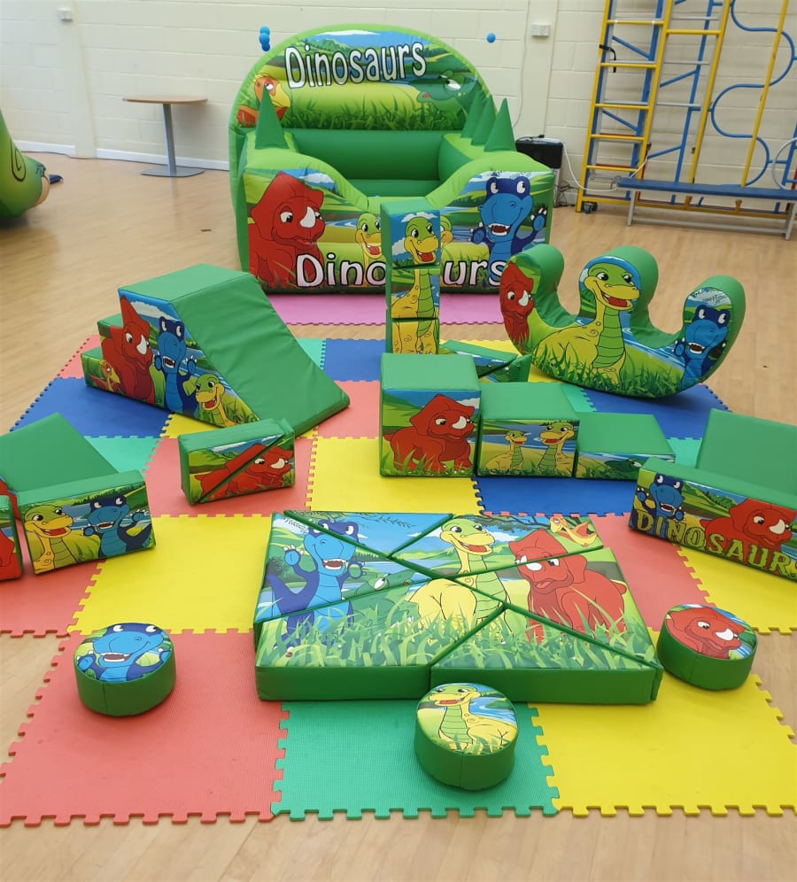 The set includes dinosaur ball pool hire, with high, inflatable sides to keep them safe and six air jugglers to keep them giggling. Plus you’ll get a full set of dinosaur soft play shapes, including ride on shapes, steps and slides, jigsaws and tall stackers, all laid out on a soft, safe interlocking playmat.