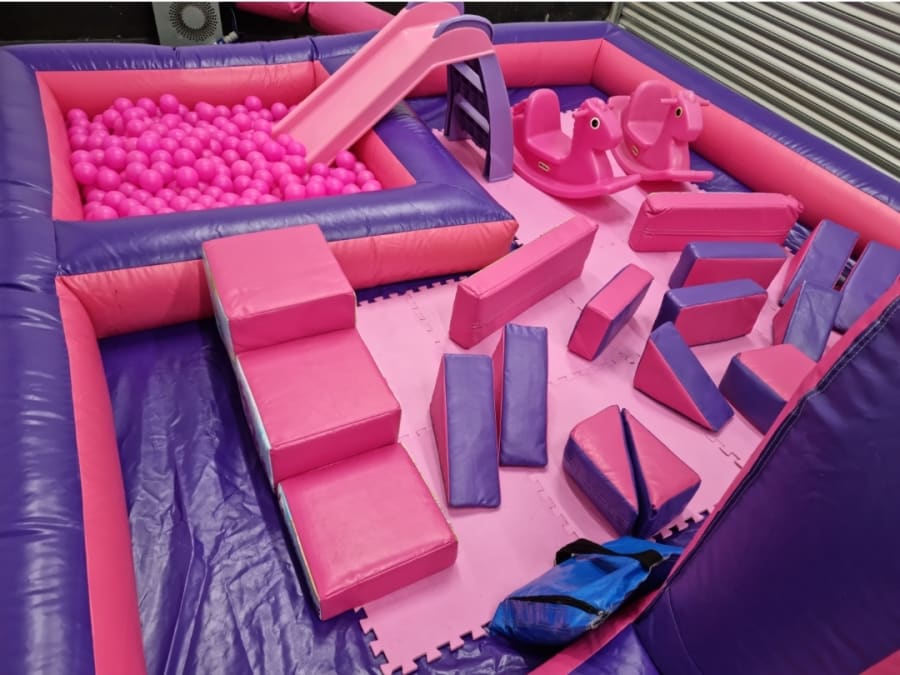 Pink Soft Play Surround for hire in Rotherham, Doncaster and Sheffield and across South Yorkshire Your complete toddler party in one, with everything you need for hours of fun! This amazing value set can turn any venue into the ultimate toddler playground in minutes, and it will keep your little ones amused for hours. The set includes a pink and purple ball pool with its own Little-Tykes-style slide, a pair of ride on rocking horses, a full set of squidgy foam soft play shapes and a set of interlocking soft play mats to protect them as they play. Best of all, the whole thing comes complete with its own inflatable surround to keep everything contained and to help you keep those little wanderers under control. At just £100 it represents incredible value for money, and it’s low stress as well as low cost, with everything delivered and set up for you, leaving you free to organise the million-and-one other things you have to do on the day. Naturally, every item in this pretty pink toddler party set comes fully sanitised for their complete safety and your peace of mind, and we replace the soft play shapes regularly, so they always arrive in the best possible condition. For more self-contained fun for little party guests, check out the unisex playpark or the princess play park, each with a little of everything for them to enjoy. Or perhaps a party package deal might be the best for your budget. Our friendly team will be happy to run through the options with you to help you make the most of your money, so give us a call today. To reserve your date for this great value toddler play set, simply click on the ‘book online’ button below. But hurry, at just £110 our diary is filling up fast for weeks to come. For the big value on little kids’ soft play and bouncy castle hire in Rotherham, call Monster Mash now: