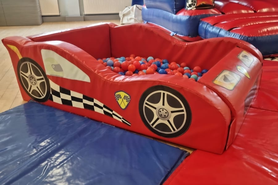 A racing car–shaped soft play ball pool, filled with bright, safe soft play balls.